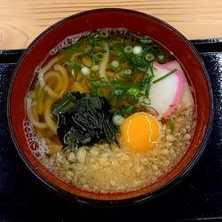 生玉子・揚げ玉・かまぼこ・ねぎ・わかめをトッピングした月見うどん。コシのつよいモチモチ麺が最後まで熱々の甘口のつゆに好相性です。